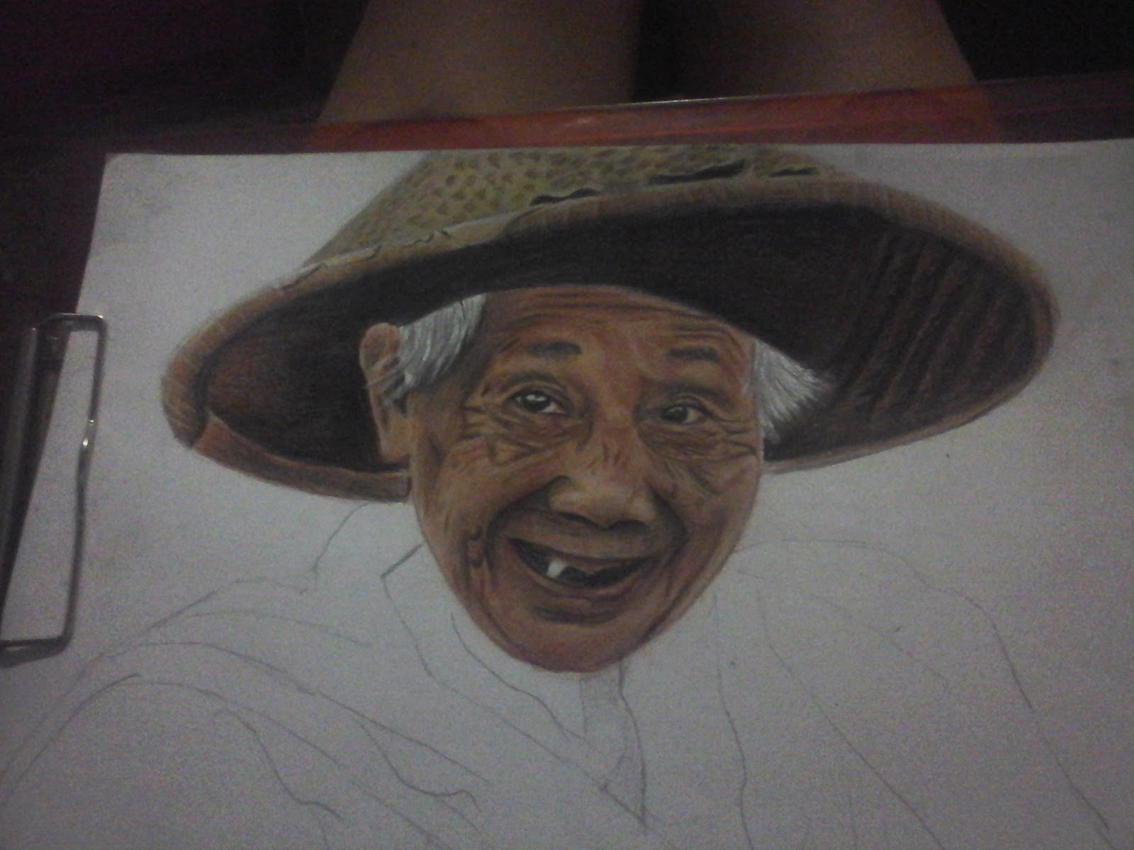 Pada tahap berikutnya saya sudah selesai mewarnai wajahnya keliatankan gigi nenek itu tinggal satu bukan dua meskipun nenek itu sudah tua... di bagian pipi ada garis kerutan senyum tersebut saya menggunakan pensil warna hitam akan tetapi menggunakan pensil warna hitam agar sedikit berhati-hati di bagian waja kesanya nanti jadi kotor kalau penggunaanya terlalu berlebihan nah cukup sampai di situ kita lanjut ketahap berikutnya
